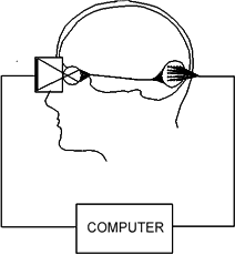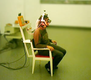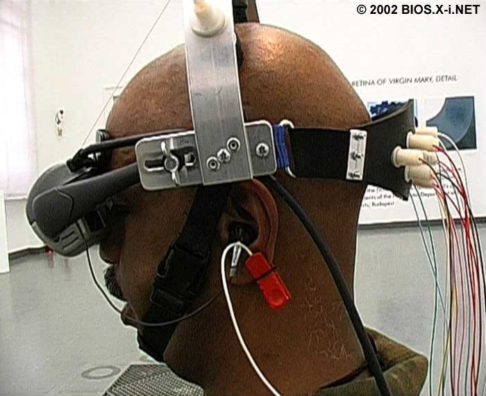 Because the transformation of light energy into the language of the brain takes time, our seeing is always delayed. The visual and aural impulses emitted by a nearby object reach our brain at different times. Thus, due to the divergent temporal performance of our sensory organs, events that are objectively simultaneous are subjectively dislocated in time. Although these differences are very slight in terms of human perception, use of the term "simultaneous" is justified neither in the physiological nor quantum-mechanical sense. Everything that one sees, hears, smells and feels occurred prior to our perception of it. In other words: We "scan" reality in similar fashion to the frames of a film. A feeling of time is generated by the clocking of this scanning, by the density of registering modifications. It is very evident how dependent perception is on the biological condition of the perceiving creature. A cold lizard perceives time more slowly than does a warm one. In stressful situations, time seems to pass faster than when we are enjoying a peaceful rest. Besides the above problems, one runs into real, and not purely linguistic, difficulties when trying to decide if it would be possible to distinguish between a simulation of all senses (by some kind of machine not yet invented) and the ”real” world. At the moment, we are remote from building such a machine, but we imagine that at least some of our readers have had dreams in which they touched, heard, saw or even smelled things as vividly if they were awake. One possibility of gaining a sense of what perceptional interpretation means would be to amplify it. In other words: If we found a way of tapping the perceived signal after its transformation, then it could be ”fed back” in order to be transformed again, and this re-transformation would be repeated an undefined number of times and amplified in the process. Basically, that is what BIOS does. The Apparatus An exterior audiovisual perception path forming a closed loop with the natural path is generated. The viewer is invited to immerse himself in his own (physiological) perception. The attached electrodes transfer to an electroencephalograph (EEG) signals from the three sensory areas of the brain cortex, namely the visual cortex V1 along with the two auditive cortices